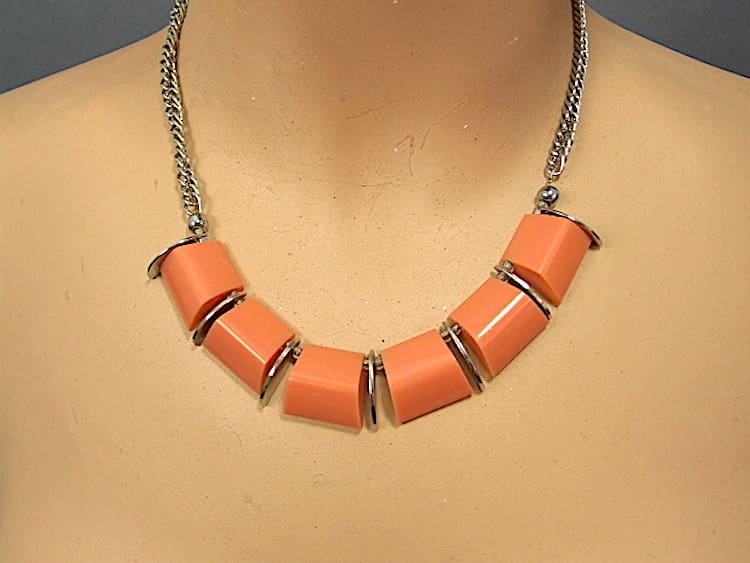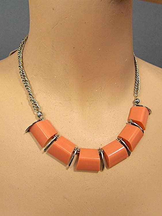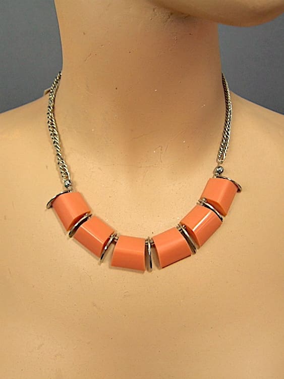 Coral galalith and chrome necklace. Made by Bengel in the early 1930s and fitted with a screw clasp.