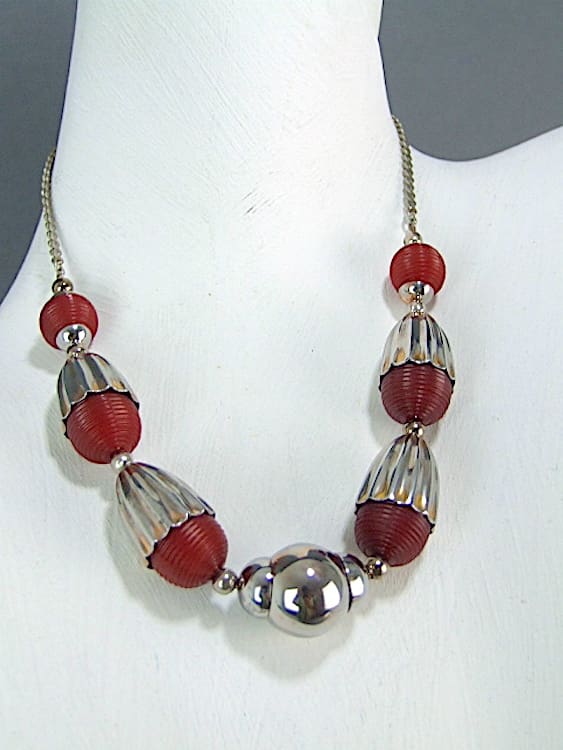Early 1930s art deco necklace with chromed fluted cups containing red ribbed galalith beads. Made by the Jakob Bengel company.