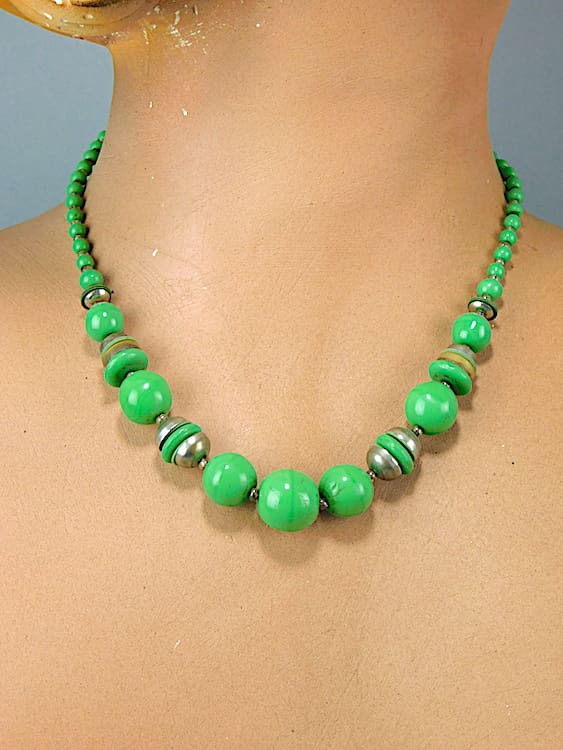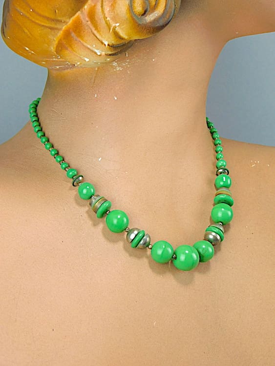 Green glass balls and chrome modernist necklace, made in the early 1930’s in Czecoslovakia.