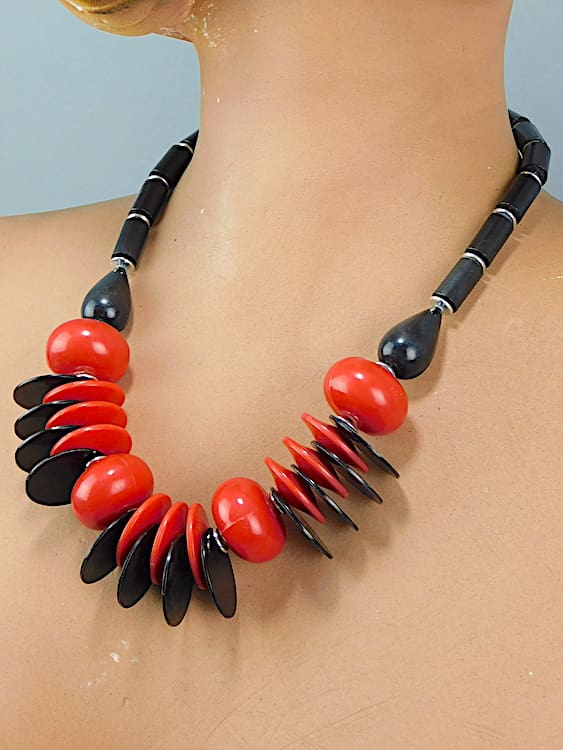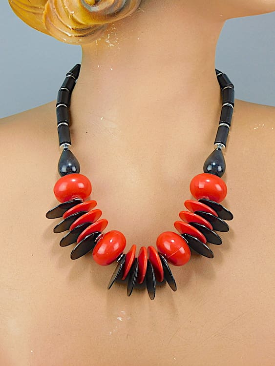 This red and black necklace probably dates to the 1970’s, made of a phenolic plastic material.