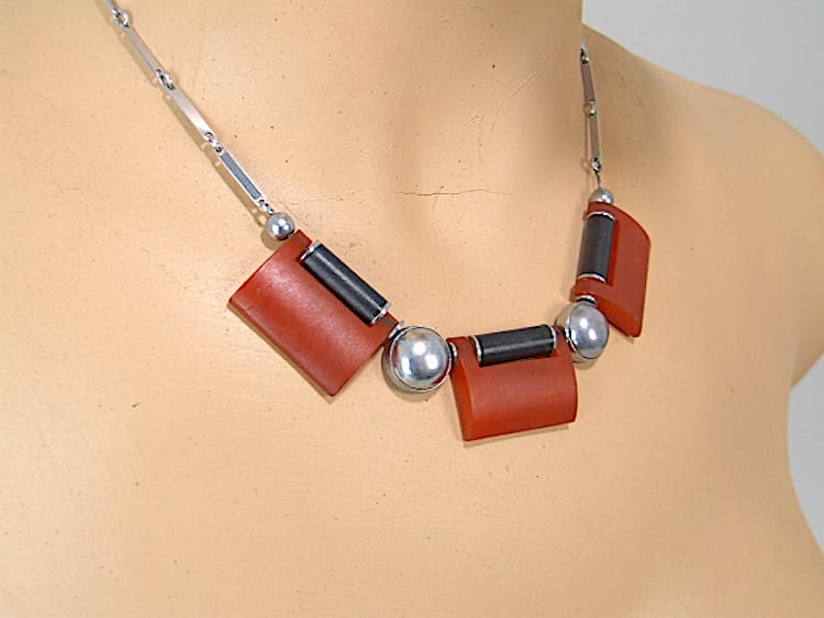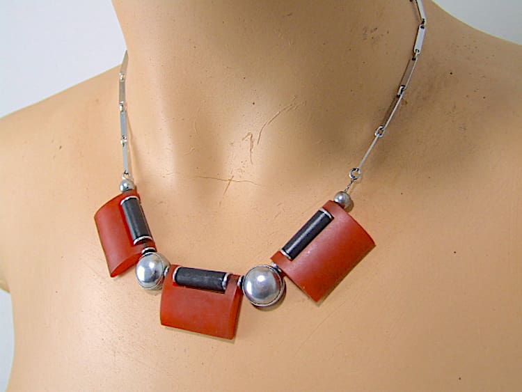 Made in the 1920s – 1930s by the Jakob Bengel company in Germany. This is a vintage and used art deco necklace.