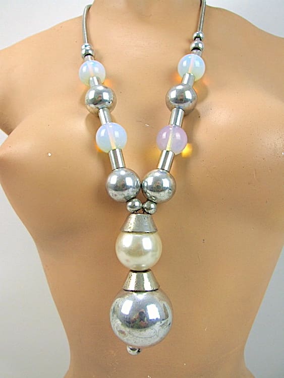 Large and chunky pearlised and chrome bead necklace. This is quite a heavy and long necklace so don’t knock yourself out doing the Charleston in it