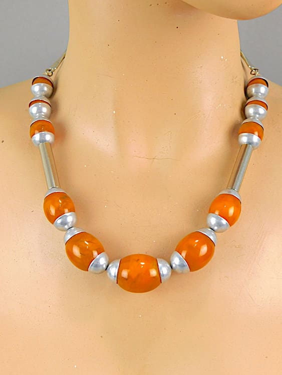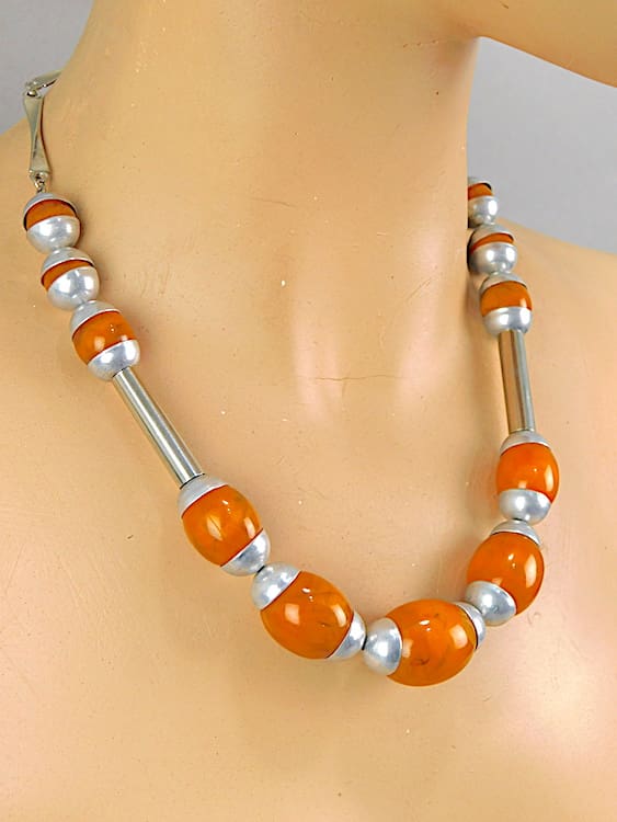 A wonderful and chunky German, Bauhaus style orange marbled galalith and aluminium cupped necklace directly from the workshop of Jakob Bengel.