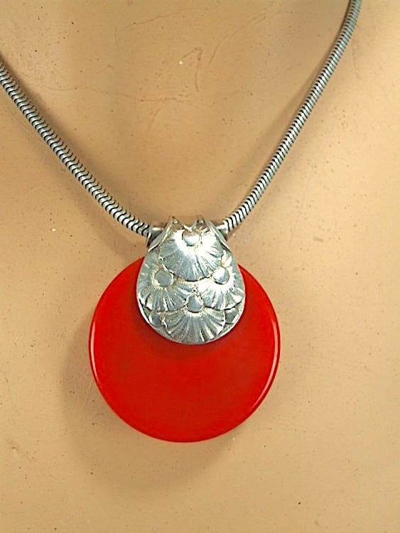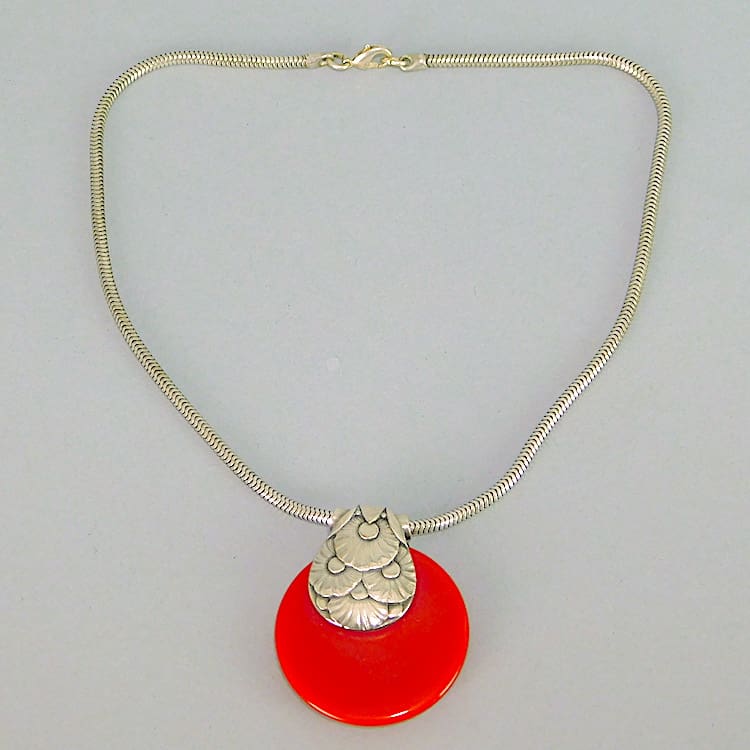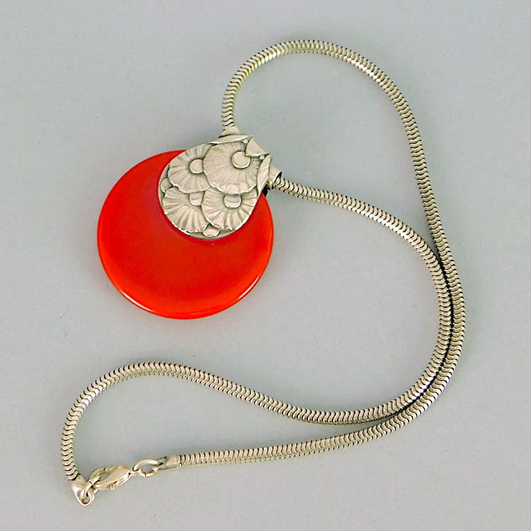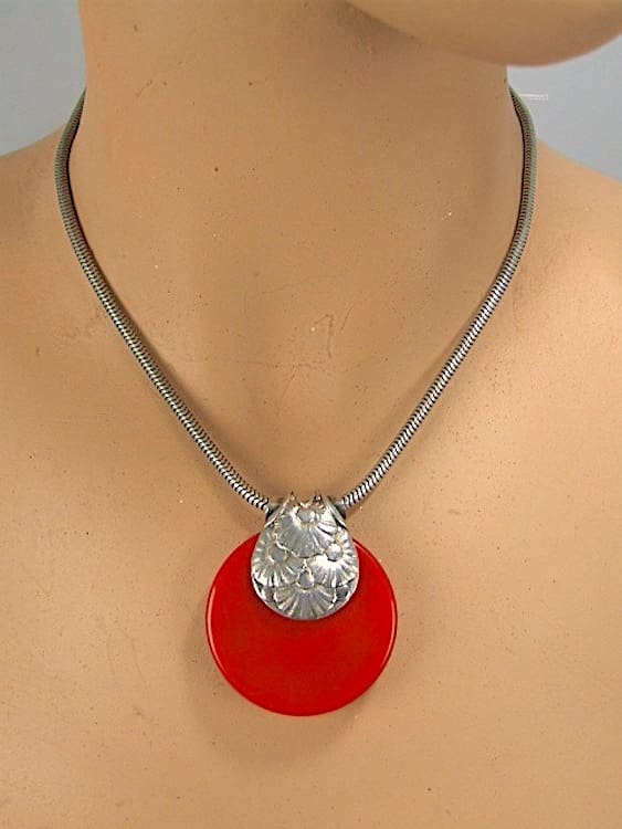 Floral silver metal and red galalith panel. Strung on a snake chain.