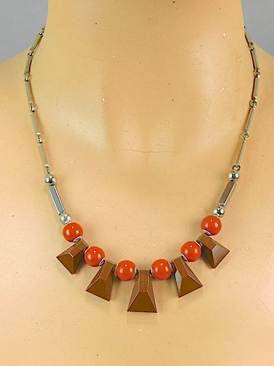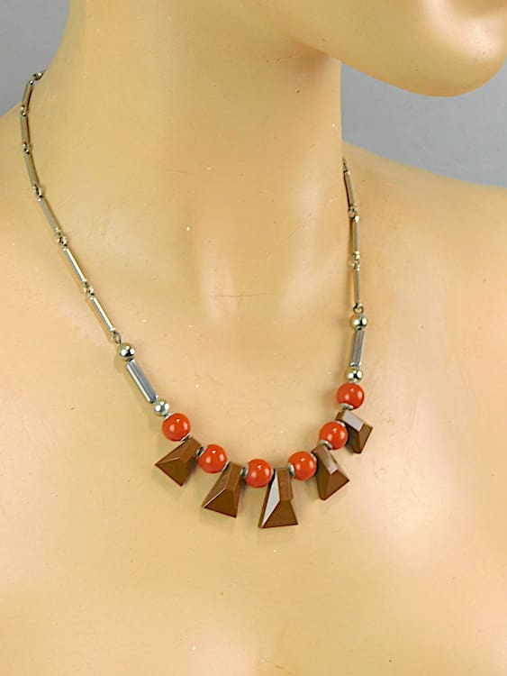 Chrome and orange and brown galalith necklace made in the 1930’s by Jakob Bengel.