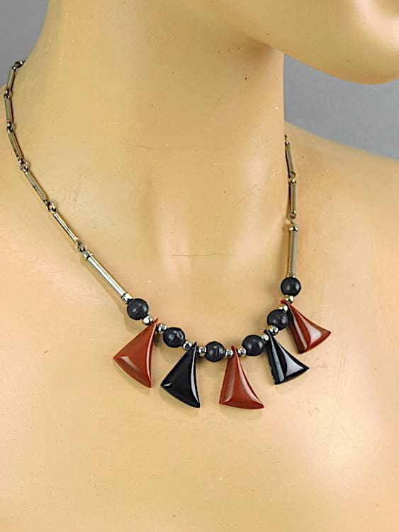 Chrome and black and brown galalith beans necklace made in the 1930’s by Jakob Bengel.