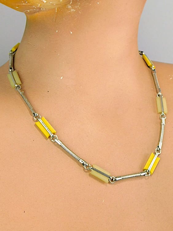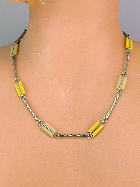 Two tone yellow galalith sections interspersed with chrome snake chain joiners.