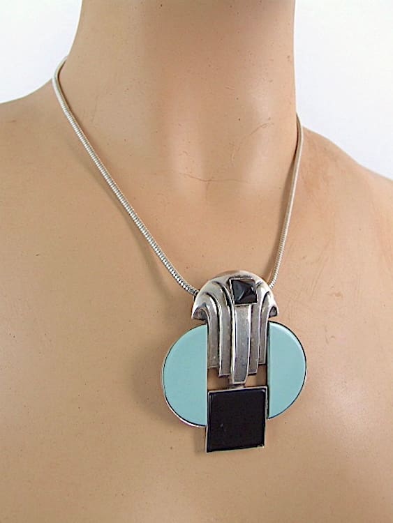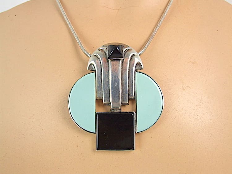 French silver plated metal and phenolic art deco odillon necklace. Mounted on a snake chain.