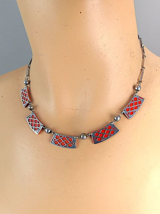 A smaller more delicate necklace in chrome with red galalith. The chain has a similar filigree patterning to the central panels, typical of Bengel’s work.