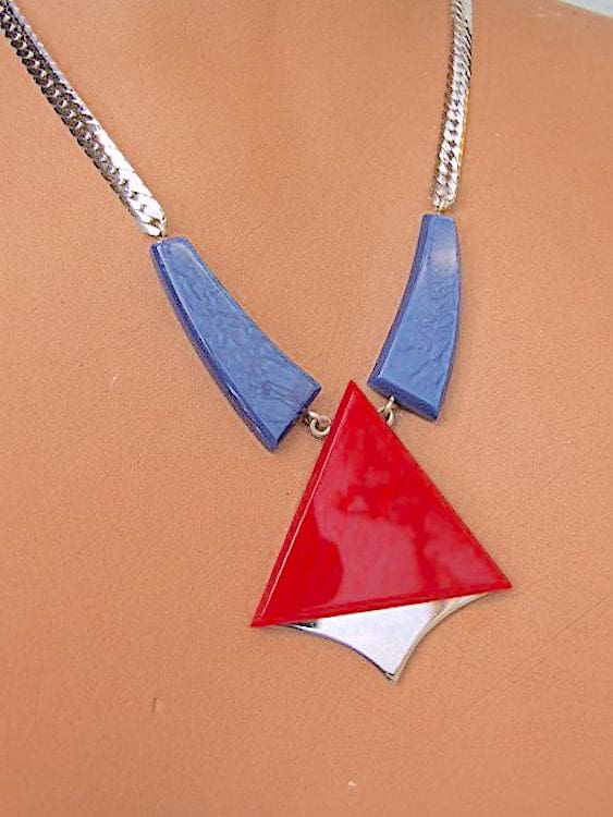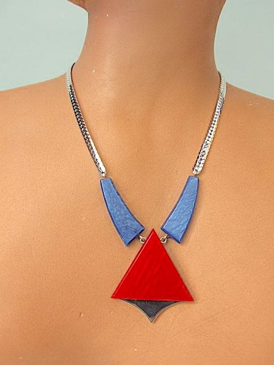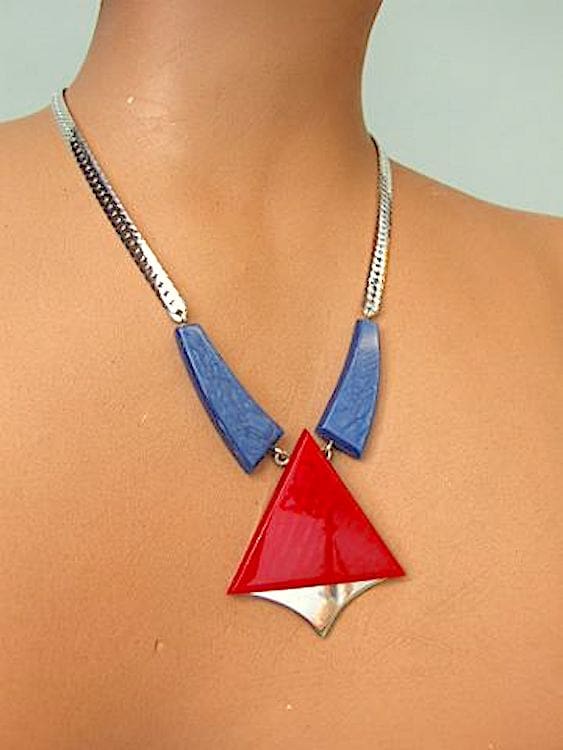 Red and blue galalith and chrome art deco necklace by Jakob bengel.