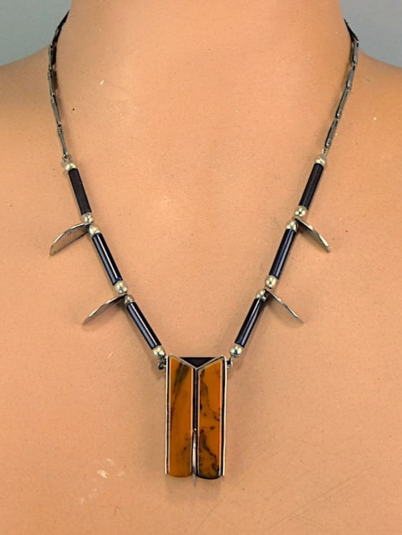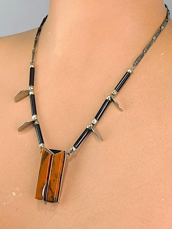 Machine age modernist butterscotch and black galalith necklace made by the Jakob Bengel company in the early 1930’s.