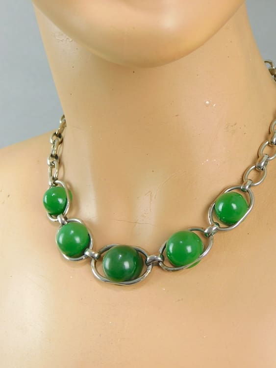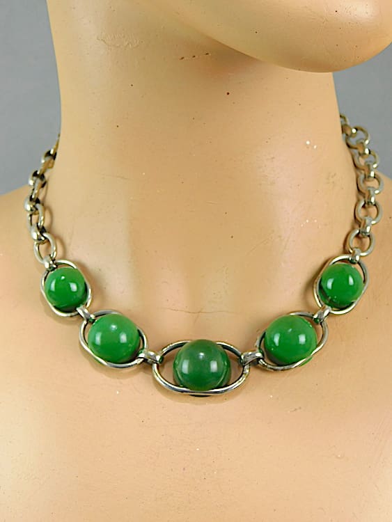 Two tone green galalith circles in chrome frames necklace, made in the early 1930’s by Jakob Bengel.