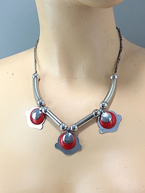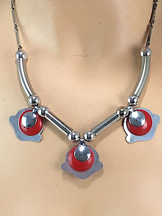 Chrome and red galalith necklace, made in the early 1930’s by the German company of Jakob Bengel.