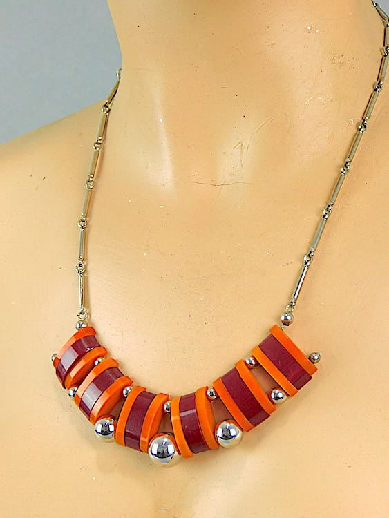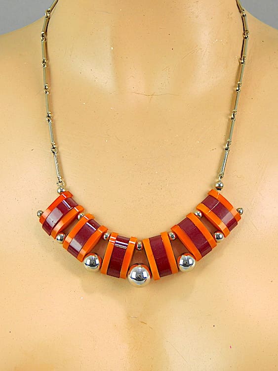Modernist chrome balls with dark red and orange galalith panels necklace, made in the early 1930’s by Bengel.