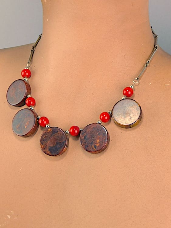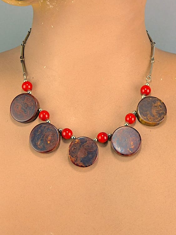 Brown marbled discs with red galalith beads and chrome chain. This necklace was made by Jakob Bengel in the early 1930’s.