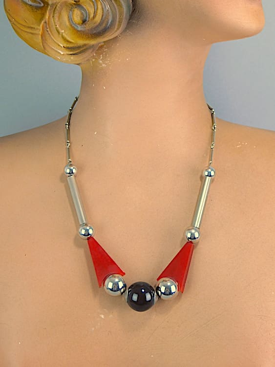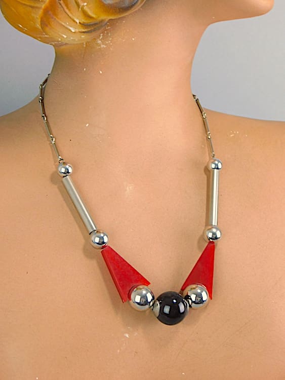 Red and black galalith and chromed metal modernist necklace. Made by Jakob Bengel company in the early 1930’s.