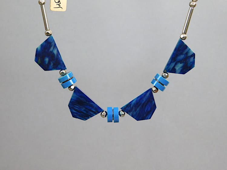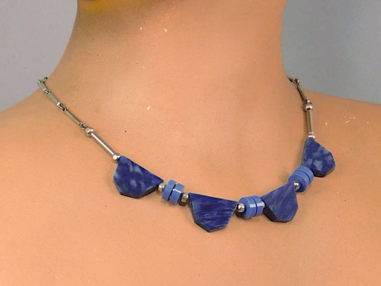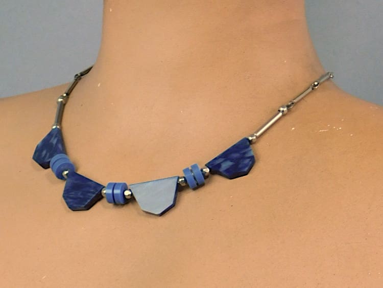 Art deco navy marbled galalith necklace made by Jakob Bengel in the early 1930s.