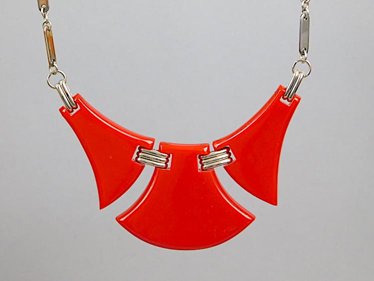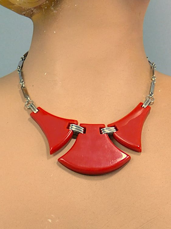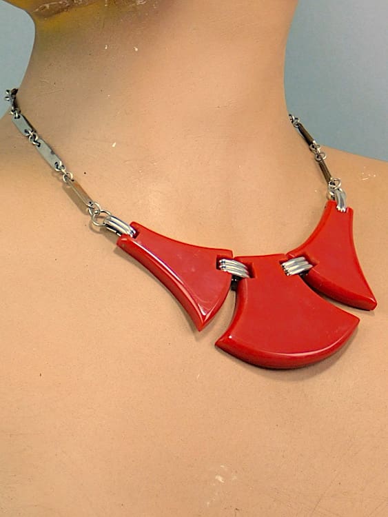 Art Deco red galalith necklace made by Jakob Bengel made in the early 1930s.