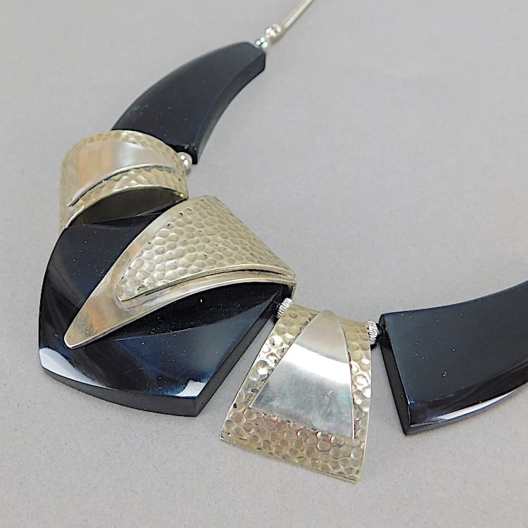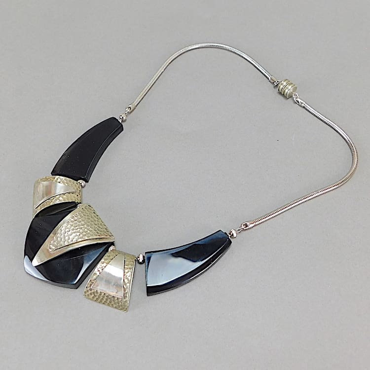 Modernist Art Deco black galalith and dimpled metal necklace by Jakob Bengel.