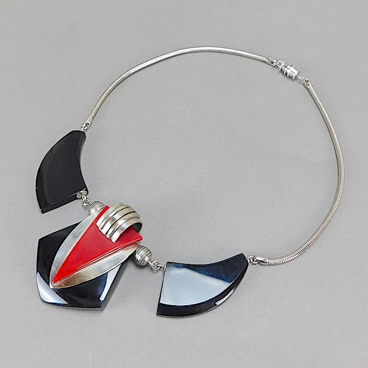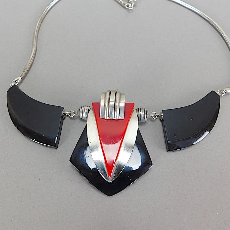 Modernist Art Deco black and red galalith fan necklace by Jakob Bengel.