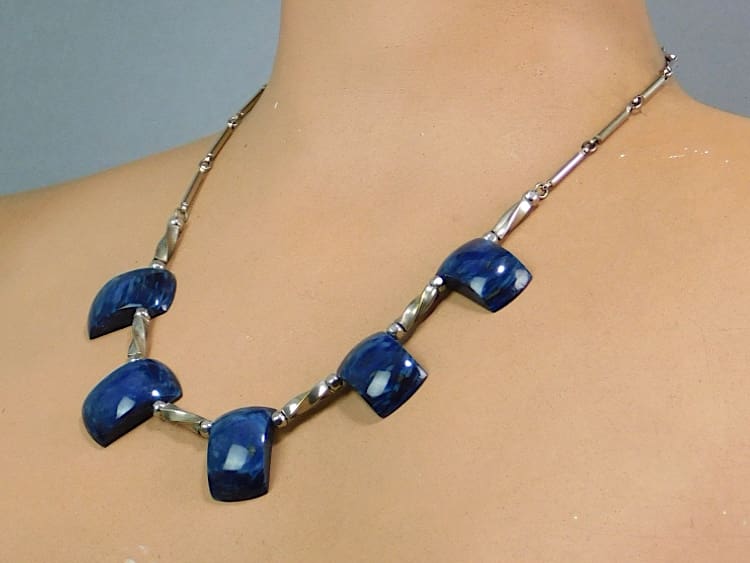 Art deco navy marbled galalith necklace made by Jakob Bengel in the early 1930s.