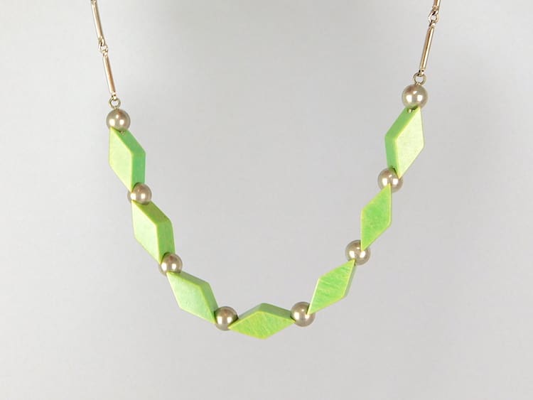 Green galalith diamond bead necklace with matching clip on earrings. It was made by Jakob Bengel in the early 1930’s.