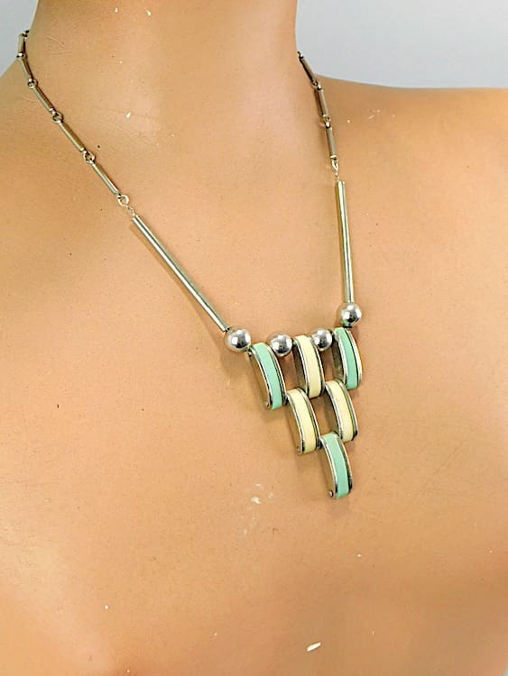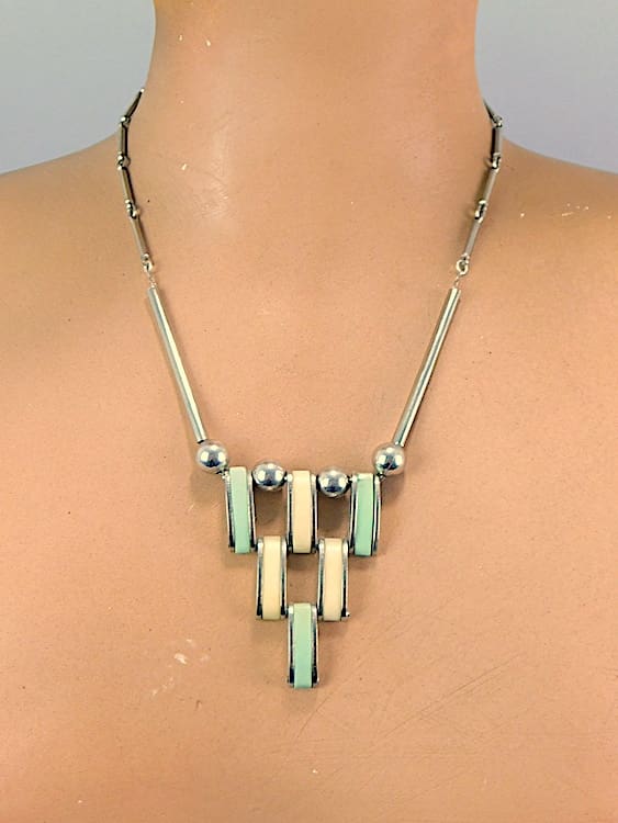 1930s modernist necklace made by Jacob Bengel. Chromed metal with cream and turquoise galalith panels.