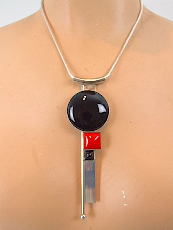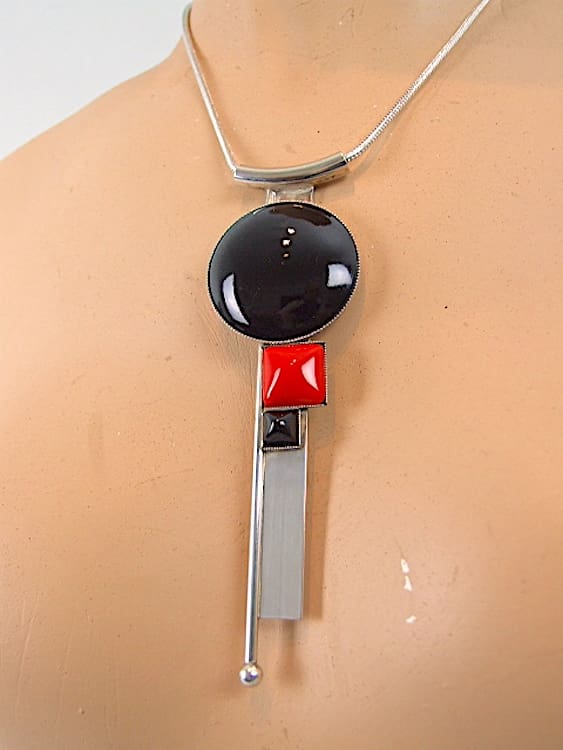 French silver plated modernist necklace with black and red onyx stones to the pendant below the large circular onyx stone. It is marked to the back Depose with an indistinct makers mark.