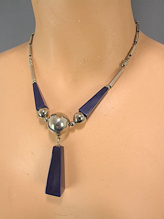 Navy blue galalith and chrome art deco necklace with chrome balls and central pyramid pendant. fitted with a screw clasp. Made in the late 1920s – early 1930s by the Jakob Bengel company in Idar Oberstein Germany.