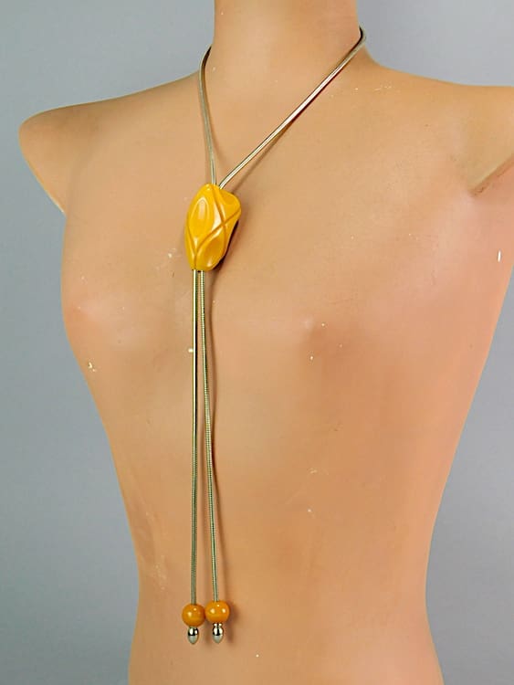 Art Deco modernist snake chain pendant necklace, made by Jakob Bengel in the early 1930s. The 2.25 inch (5.5cm) central amber galalith piece slides up and down the snake chain to adjust the length to suite the wearer.