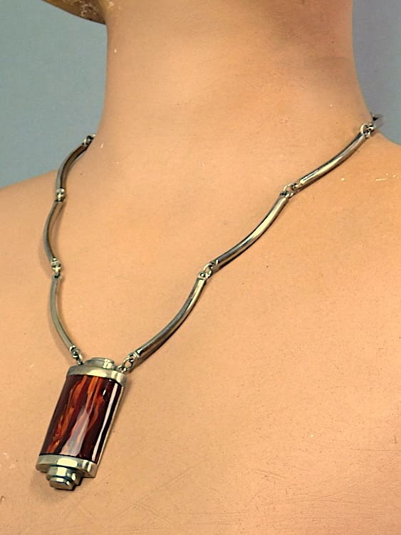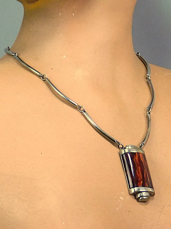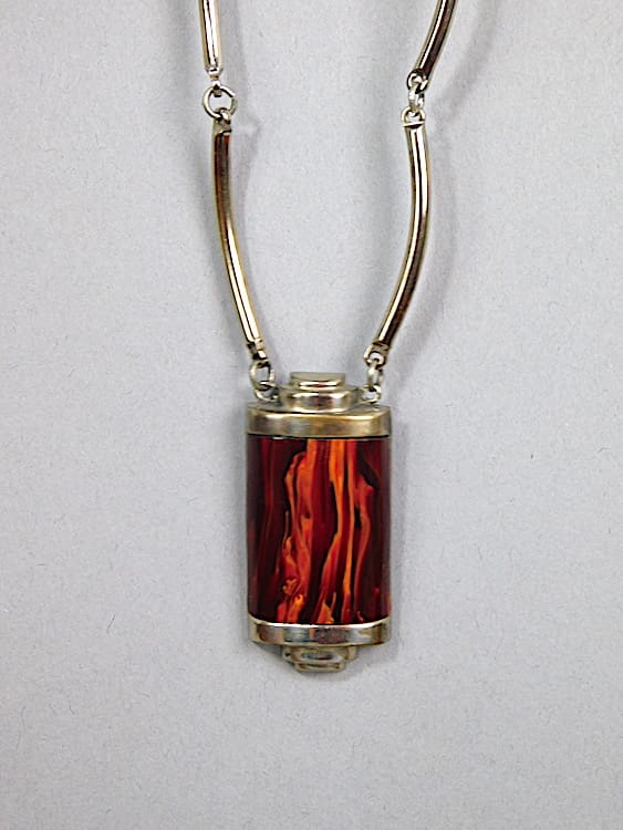 Modernist art deco henna galalith panel with stepped odillon top and bottom.