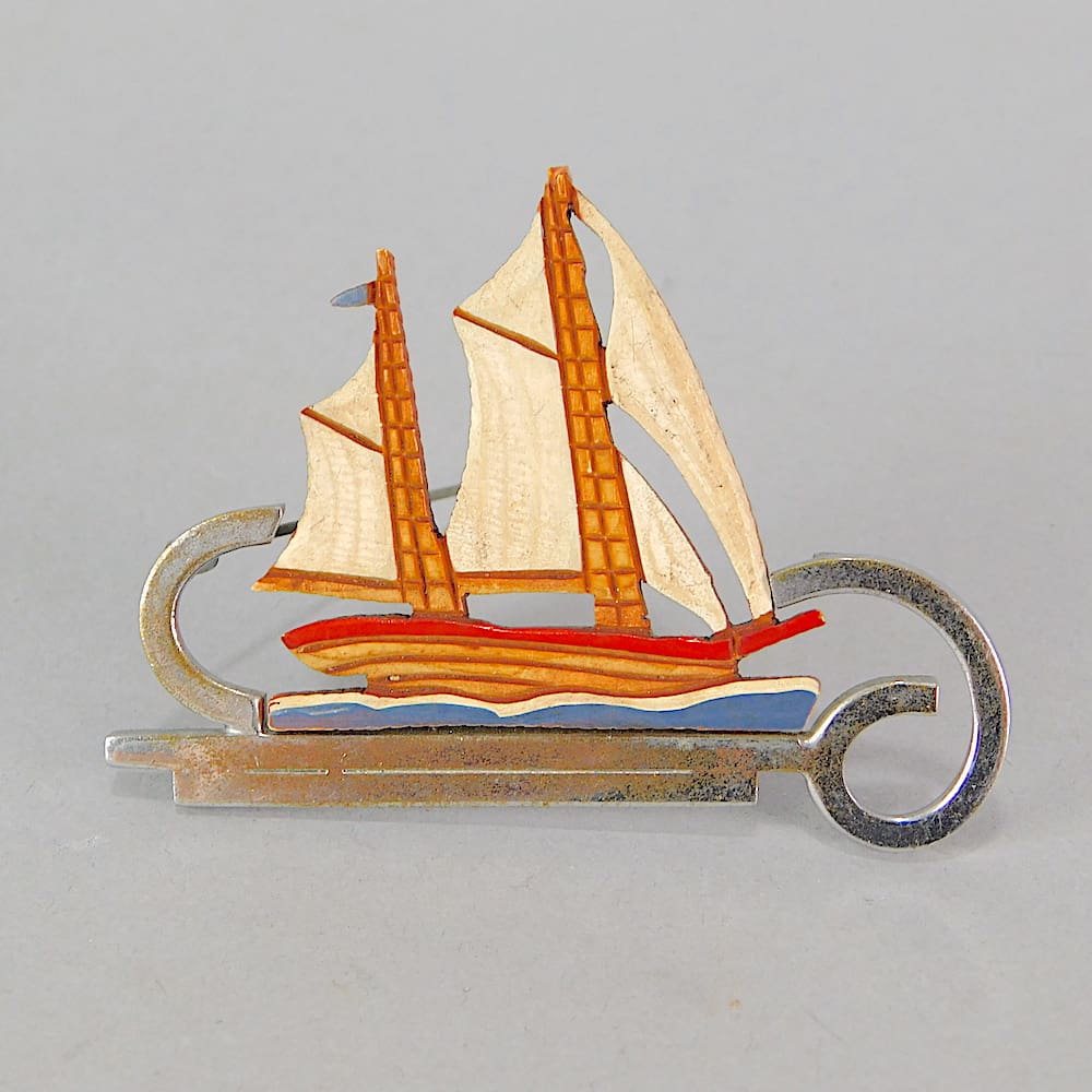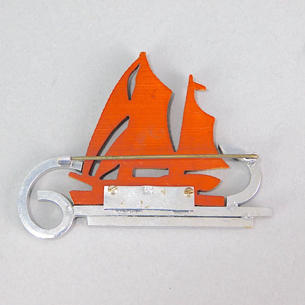 Hand painted phenolic and chromed metal modernist boat brooch.