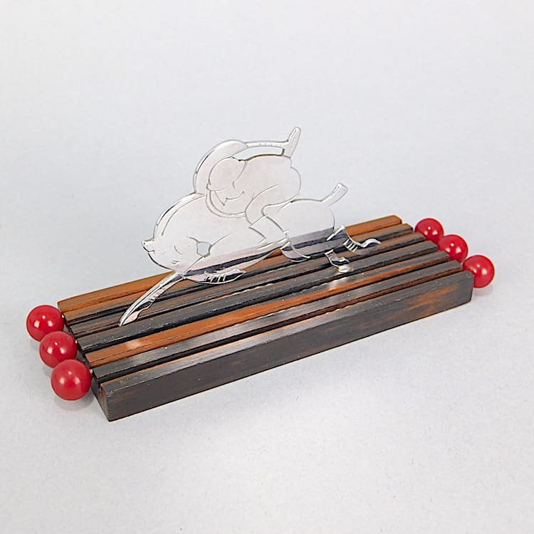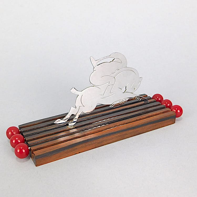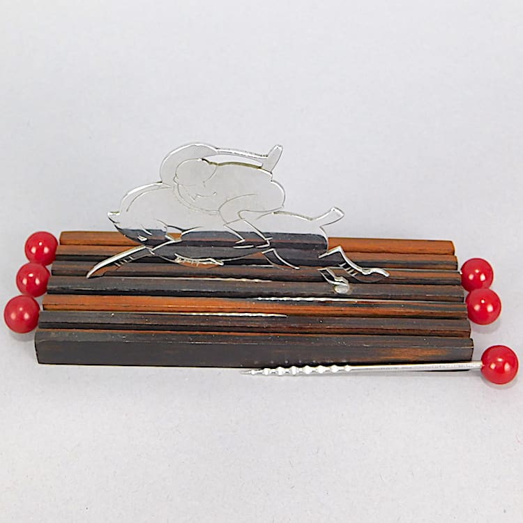 French modernist stylised chrome polo player on horseback. Designed by Sudre but unsigned. Mounted on a Macassar wooden base with grooves for 6 cocktail sticks with red phenolic handles.
