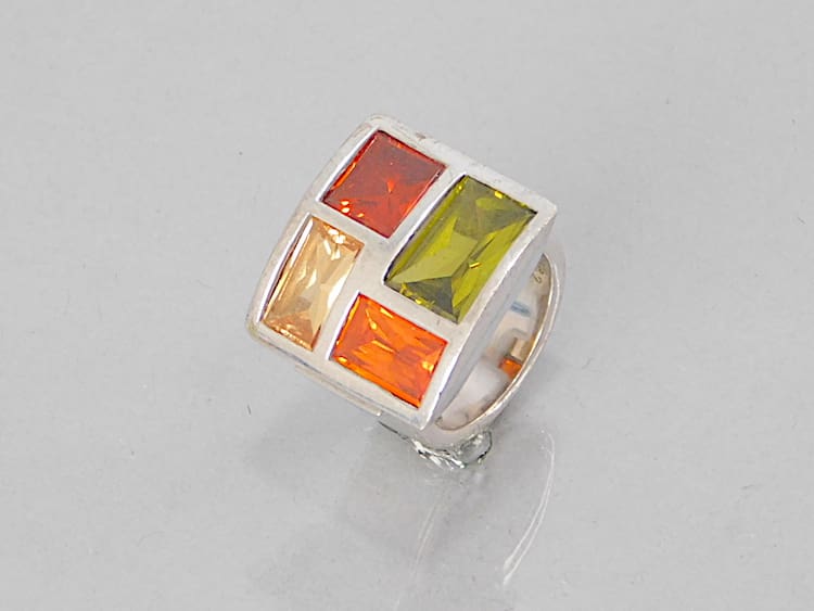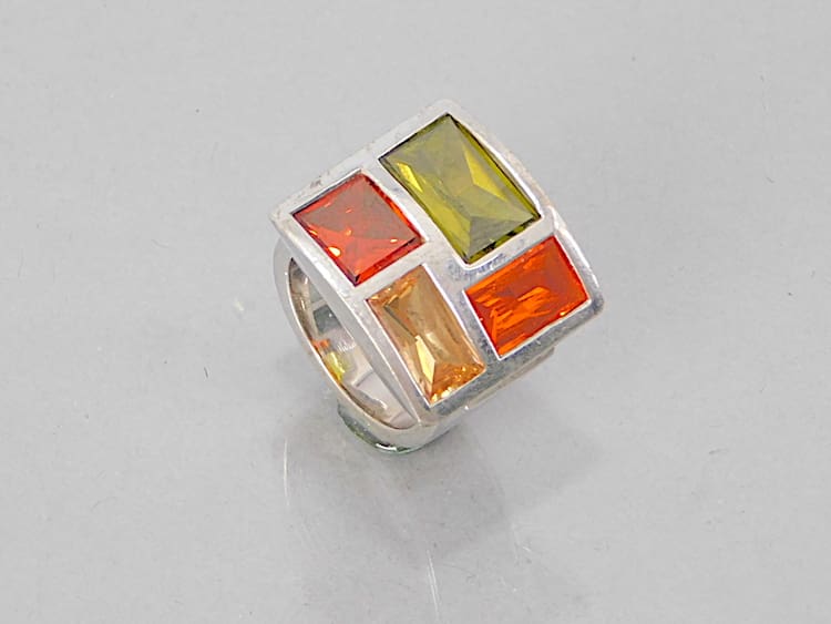 French art deco modernist chunky silvered metal ring with faceted glass panels.