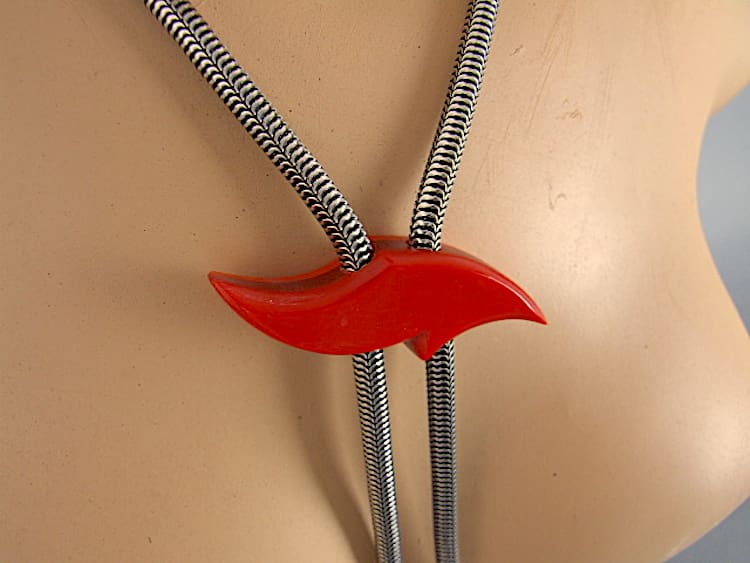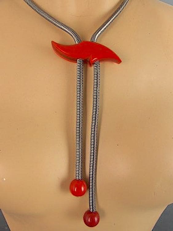 Modernist, early 1930s art deco red galalith snake chain necklace by Jakob Bengel. Adjustable length as the central red panel can be slid up and down the snake chain to suite the wearer.