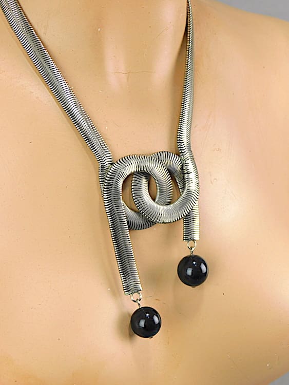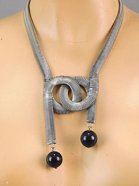 Chunky unusual double knot chrome snake necklace, made in the early 1930’s by Bengel. Chunky half inch chain with black galalith balls.