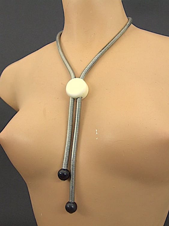 Typical book piece necklace with white and black galalith sliding central panel and black galalith beads.