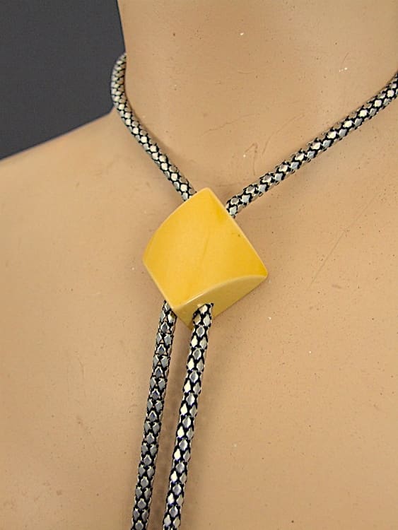 Typical book piece necklace with yellow and black galalith, yellow sliding central panel and black galalith beads.