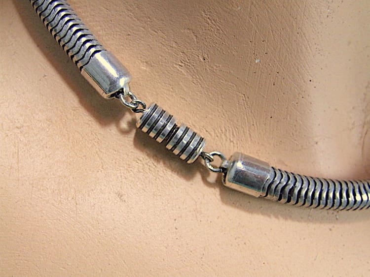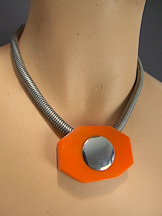 Orange galalith panel with central chromed disc hanging on a snake chain. Made in the early 1930’s by Jakob Bengel.