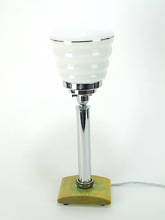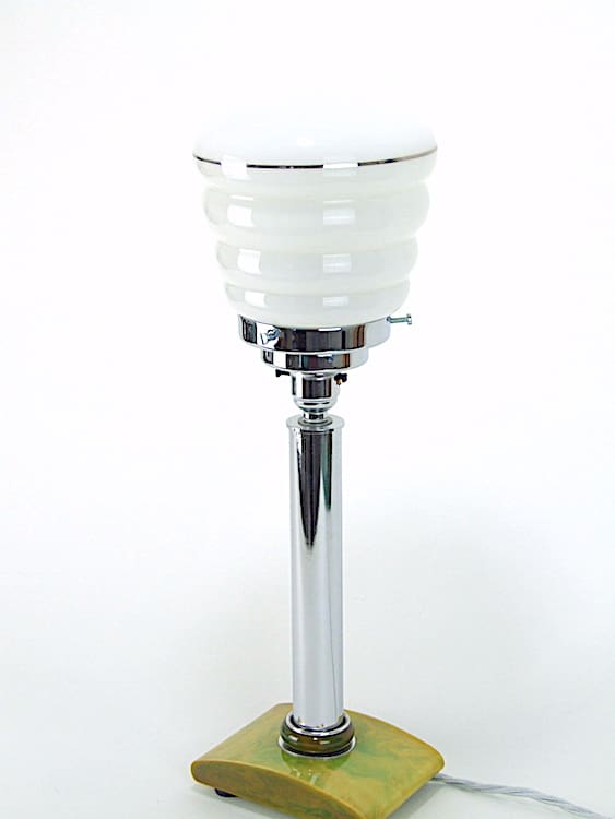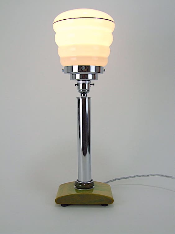 Green phenolic art deco table lamp with marbled carvacraft base, chrome tube and gallery. White shade with silver band detail.