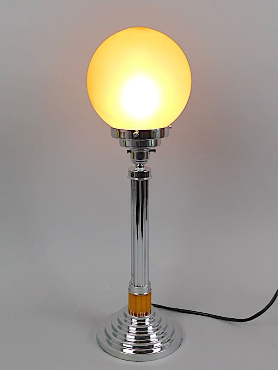 English modernist art deco table lamp with chrome stepped base, amber phenolic ribbed lower shaft and chrome ribbed upper.