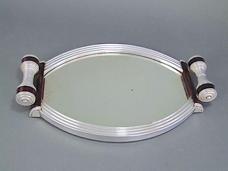French modernist tray with double scroll handles and aluminium frame with mirror glass base.