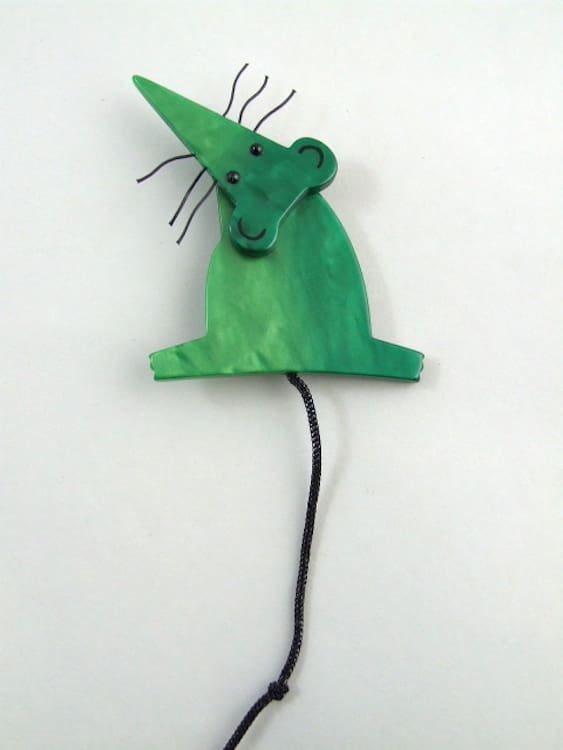 French vintage galalith art deco mouse brooch with cord tail and wire whiskers. Fitted with a roll safety clasp and signed to the rear.