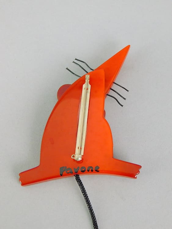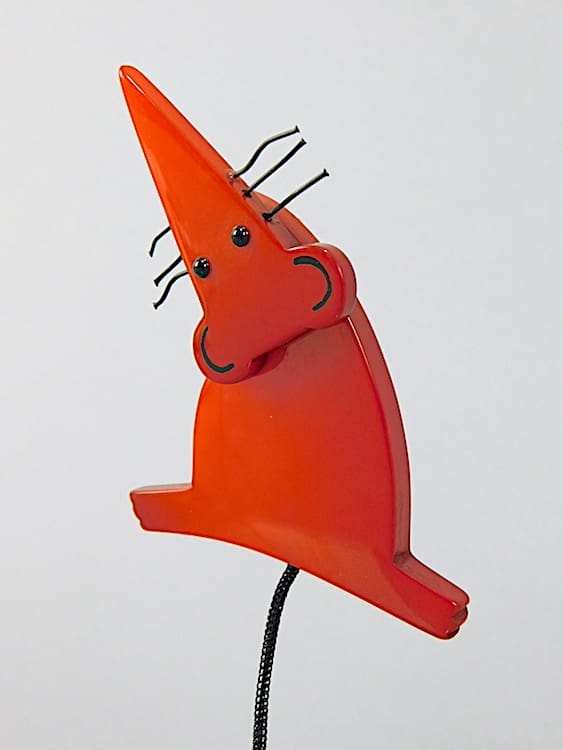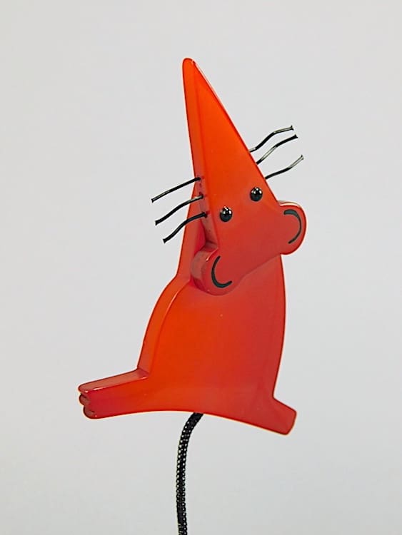 French vintage galalith art deco rat brooch with cord tail and wire whiskers.