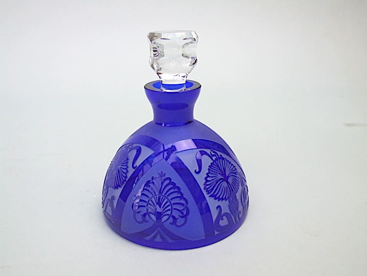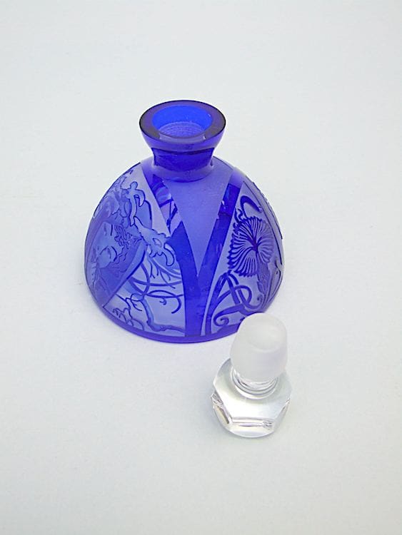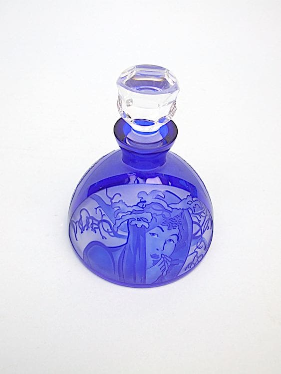 Vivid cobalt blue glass scent bottle in art Nouveau style with a Mucha pattern of a lady to the front. It was made in the 1980’s in the Czech republic.