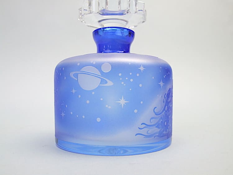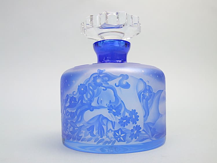 Cobalt blue glass scent bottle in art Nouveau style with a Mucha pattern of a lady to the front. It was made in the 1980’s in the Czech republic.