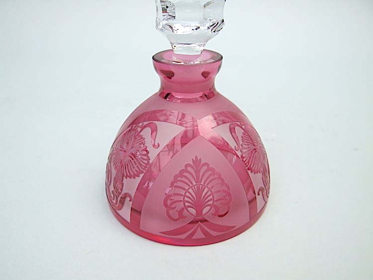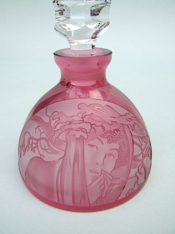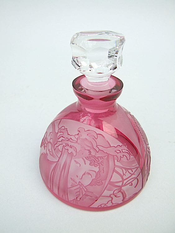 Rose pink glass scent bottle in art Nouveau style with a Mucha pattern of a lady to the front. It was made in the 1980’s in the Czech republic.