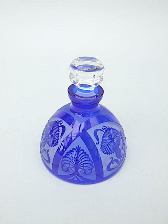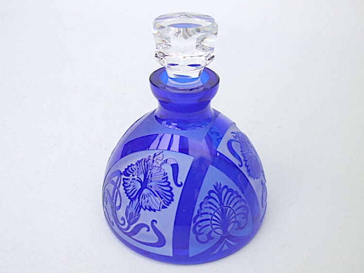 Vivid cobalt blue glass scent bottle in art Nouveau style with a Mucha pattern of a lady to the front. It was made in the 1980’s in the Czech republic.