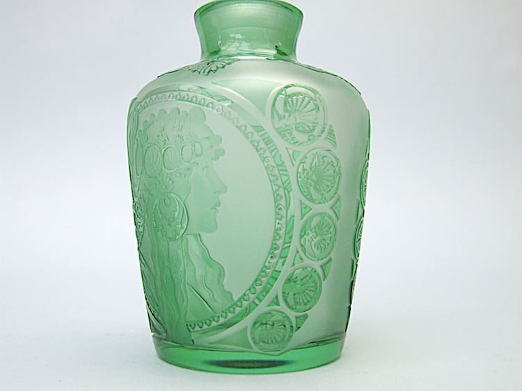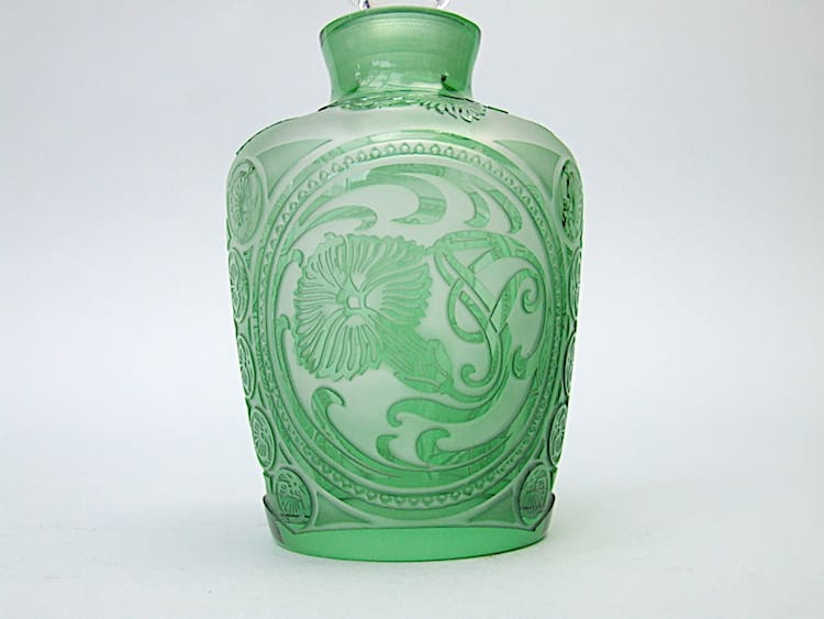 Green glass scent bottle in art Nouveau style with a Mucha pattern of a lady to the front. It was made in the 1980’s in the Czech republic.