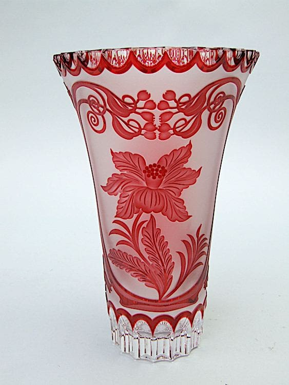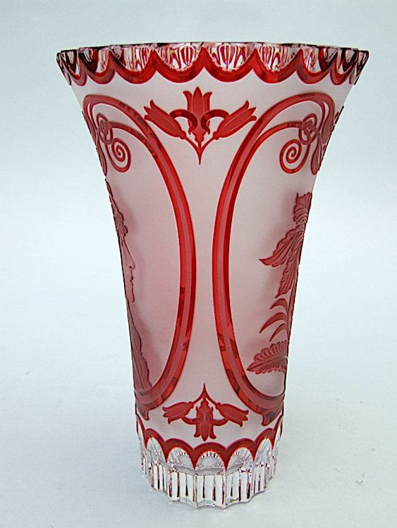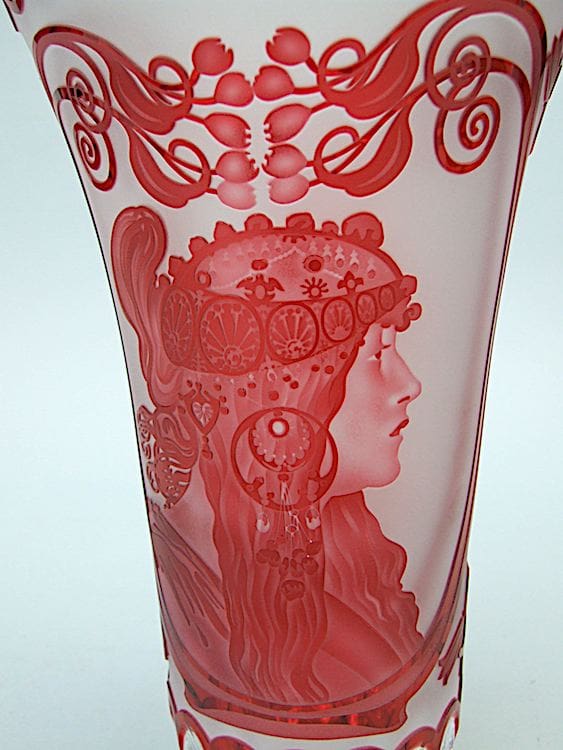 Rose pink vase with etched and enamelled Alphonse Mucha design – The Blonde. I am not sure when if was made but probably 1980’s as the underside is marked FS Czech republic.